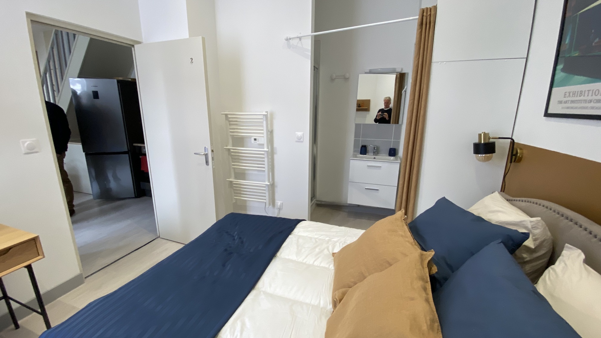 L'appartement est en duplex : il dispose de deux chambres de plain pied, bénéficiant chacune d'une salle de douche et lavabo, ainsi que de placards. La plus petite a un lit en mezzanine et un petit canapé lit d'appoint .Les deux chambres disposent de petits bureaux.