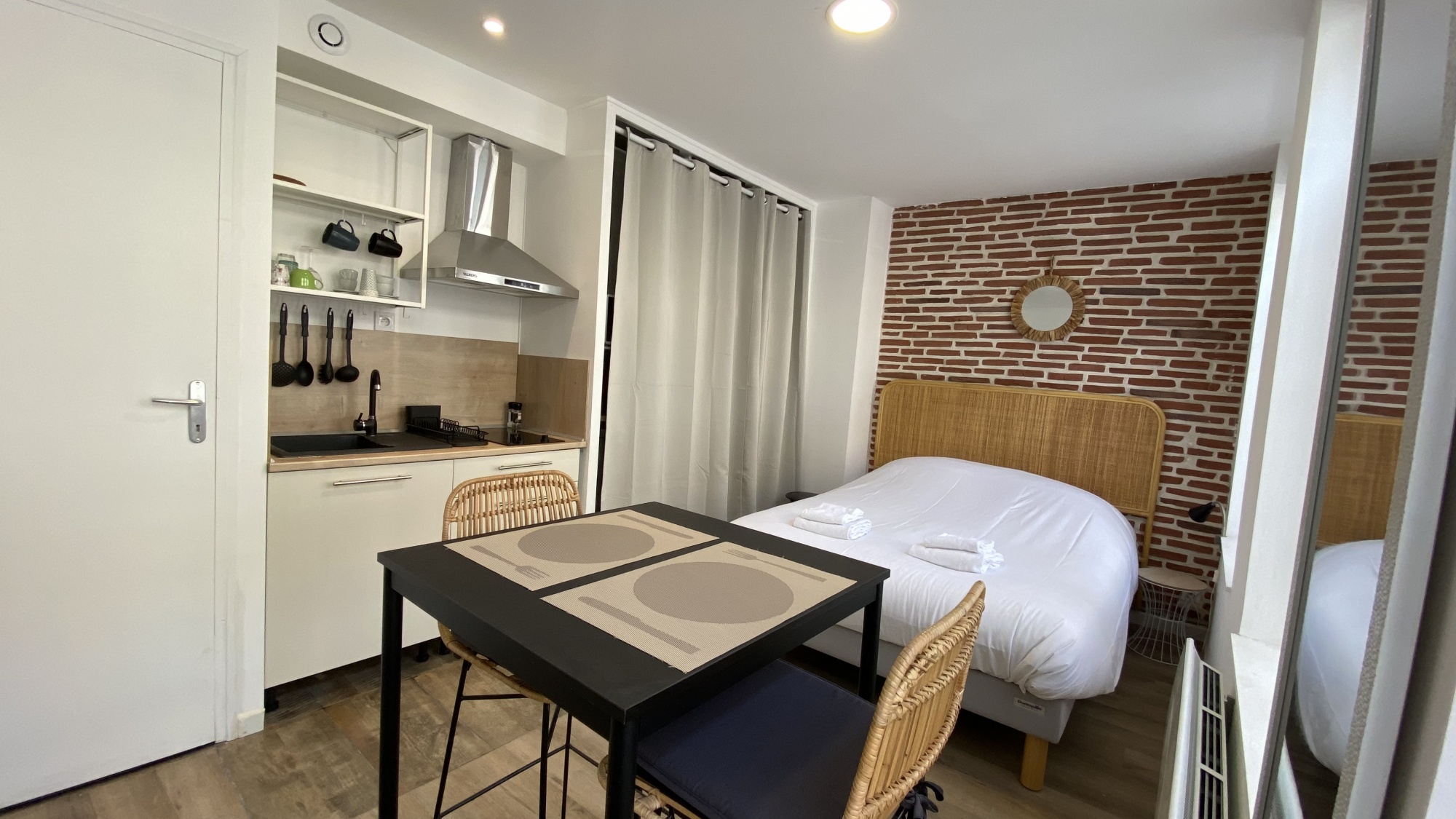 Complètement rénové en Juin 2024 , cet appart 'Hôtel dispose d'un grand lit double, un espace dinatoire, une kitchenette et une salle de douches .